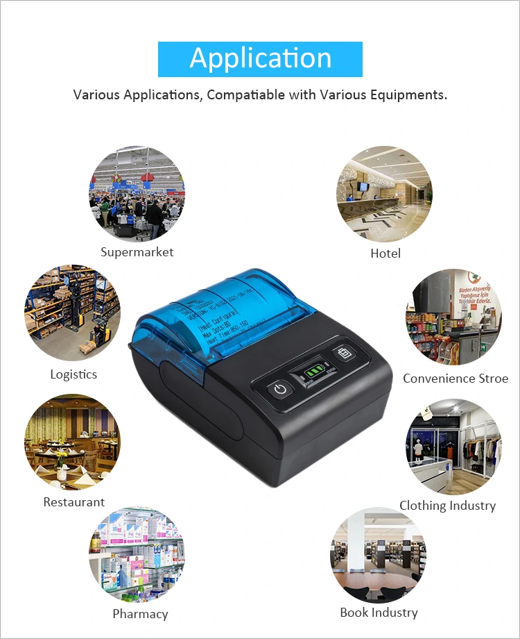 Den mobile termiske printer gør det muligt for forhandlere at nyde friheden ved mobilopladning. Den er kompatibel med alle mobiltelefoner og forskellige håndholdte terminaler. Den anvender termisk direkte udskrivningsteknologi og kræver ikke blækpatroner, hvilket reducerer omkostningerne ved højfrekvente udskrivninger for handlende.