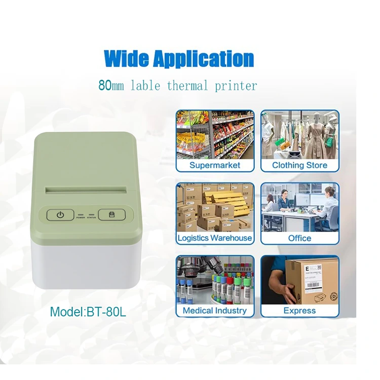 Designkonceptet for vores termiske farvelabelprinter er at gøre det muligt for kunderne at bruge den i fabrikkens lagersystemer, små detailbutikker, der skal printe små labels, til at printe små labels, stregkoder, forsendelsesmærker, klistermærker osv. 80L-modellen kan understøtte udskrivning i bredder fra 20 til 80 mm, hvilket gør den velegnet til forskellige kunder med forskellige behov. Den er designet til at være kompakt i størrelse, hvilket gør den praktisk at bære og placere.